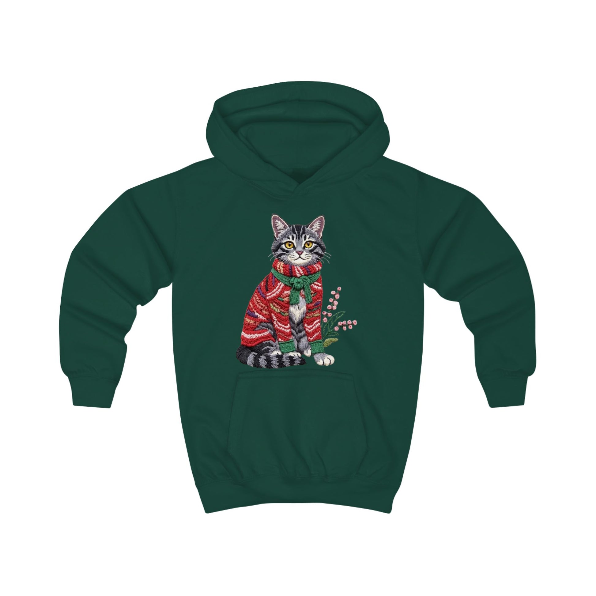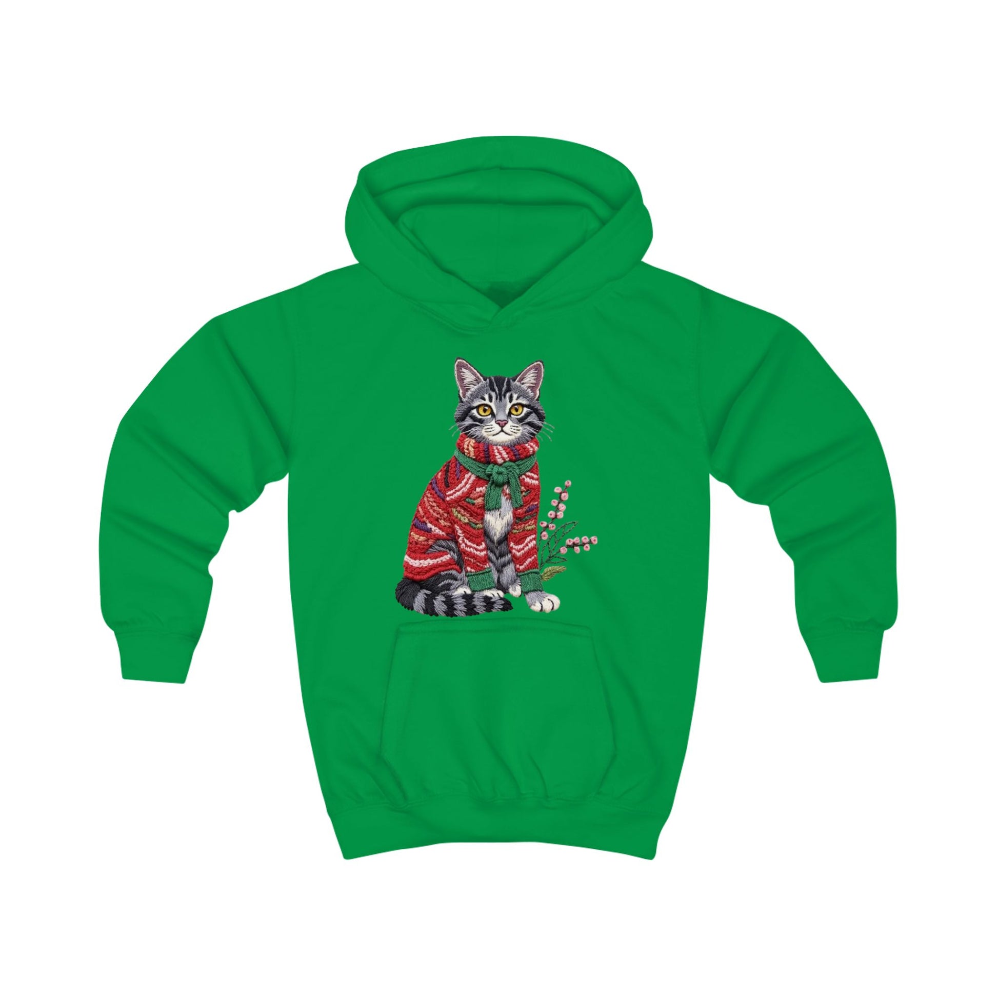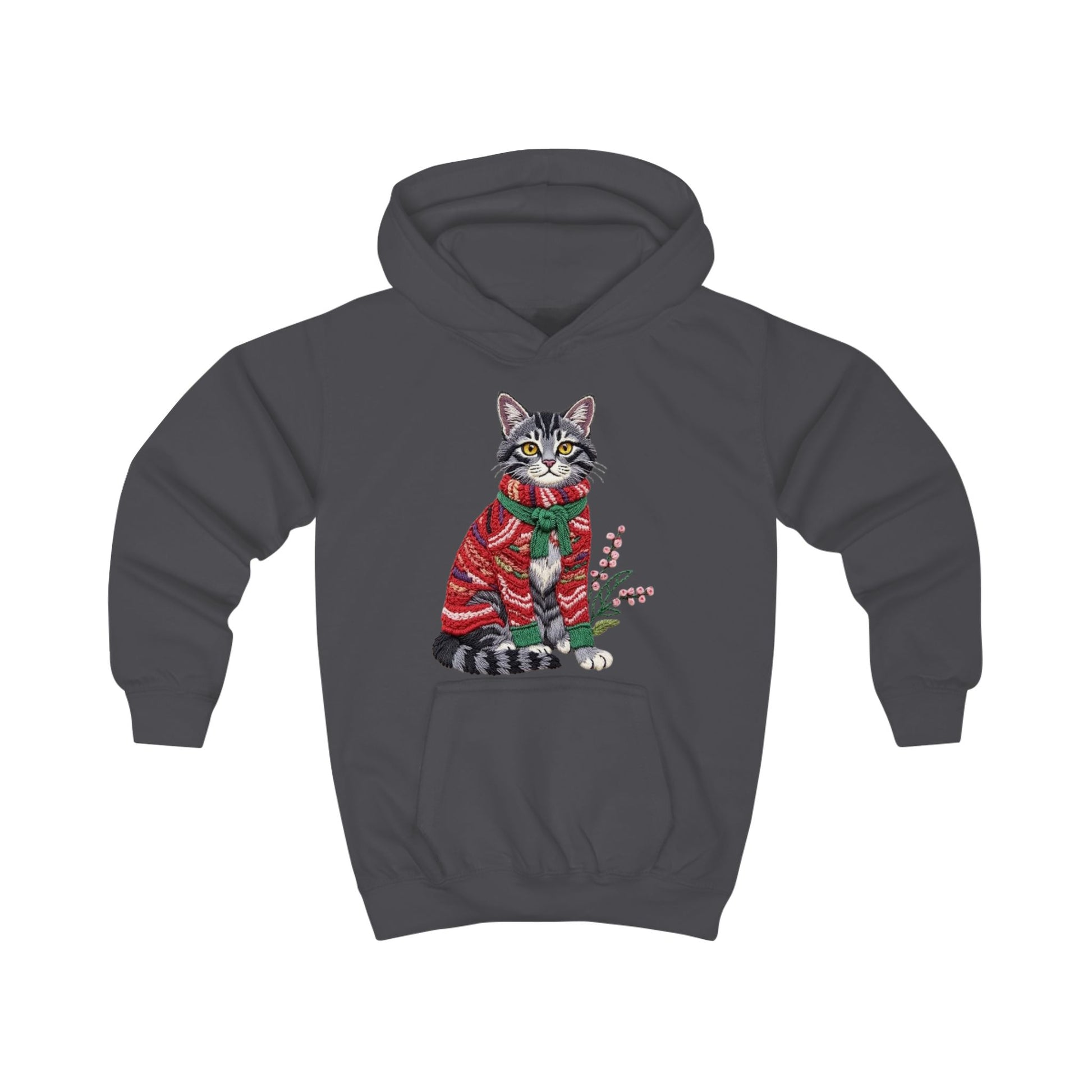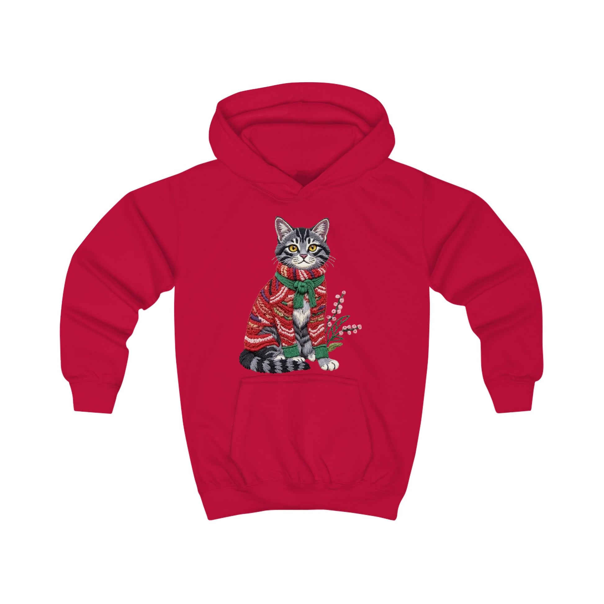 Christmas Kids Hoodie- Festive Cat in Red Christmas Sweater Holiday Hoodie