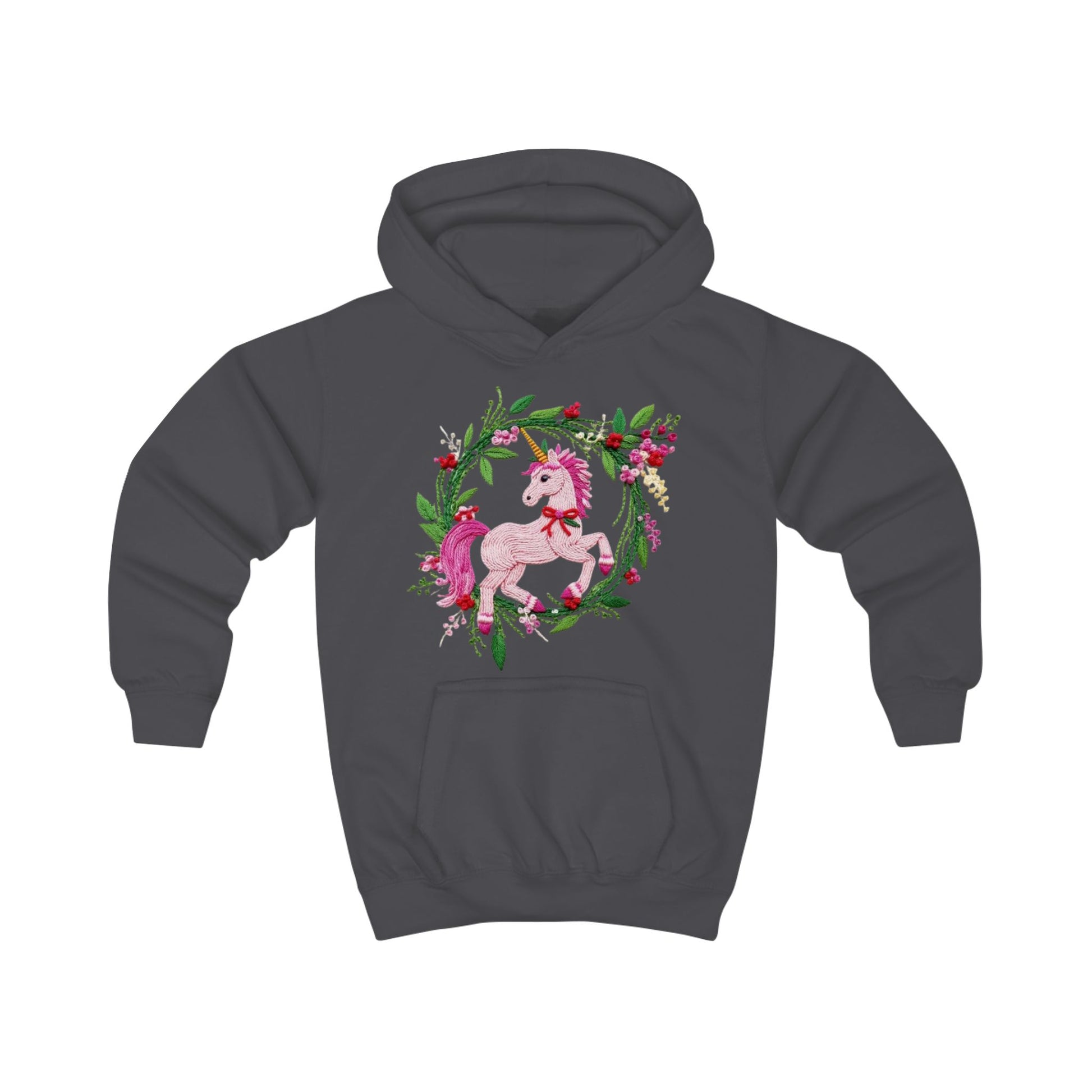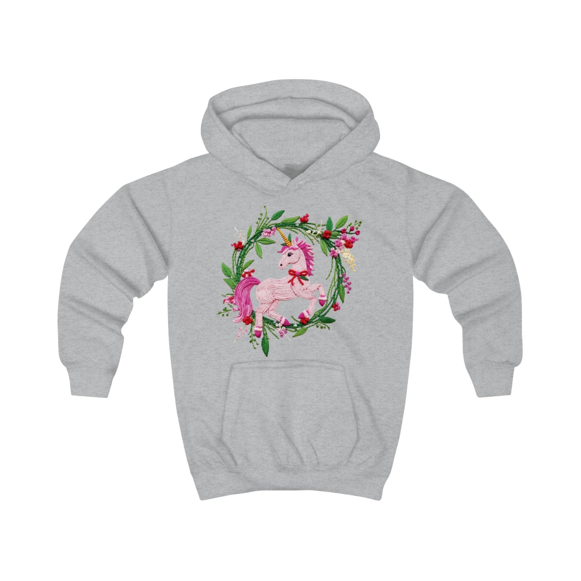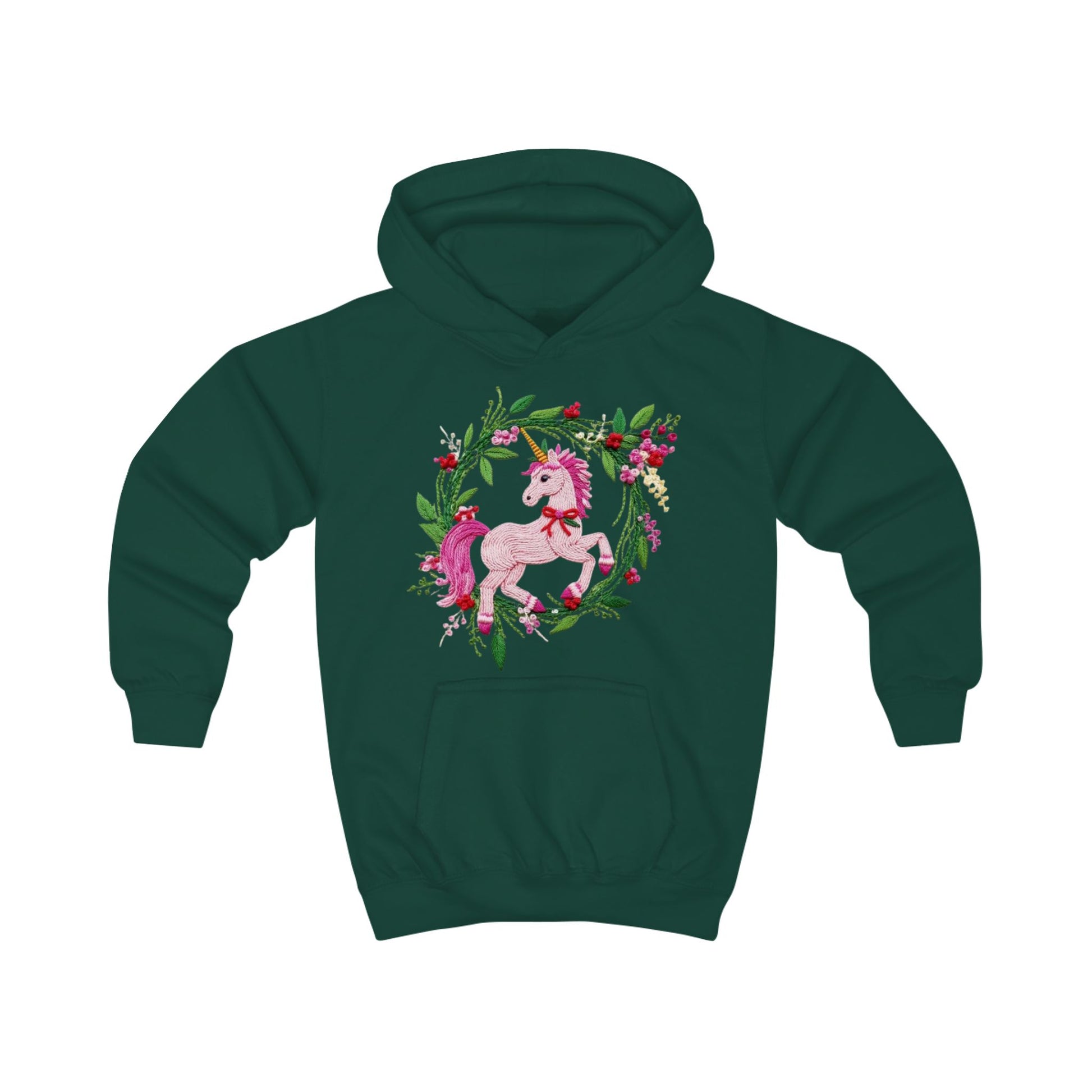 Christmas Unicorn Floral Wreath Kids Hoodie- Pink Magical Unicorn Sweatshirt for Girls